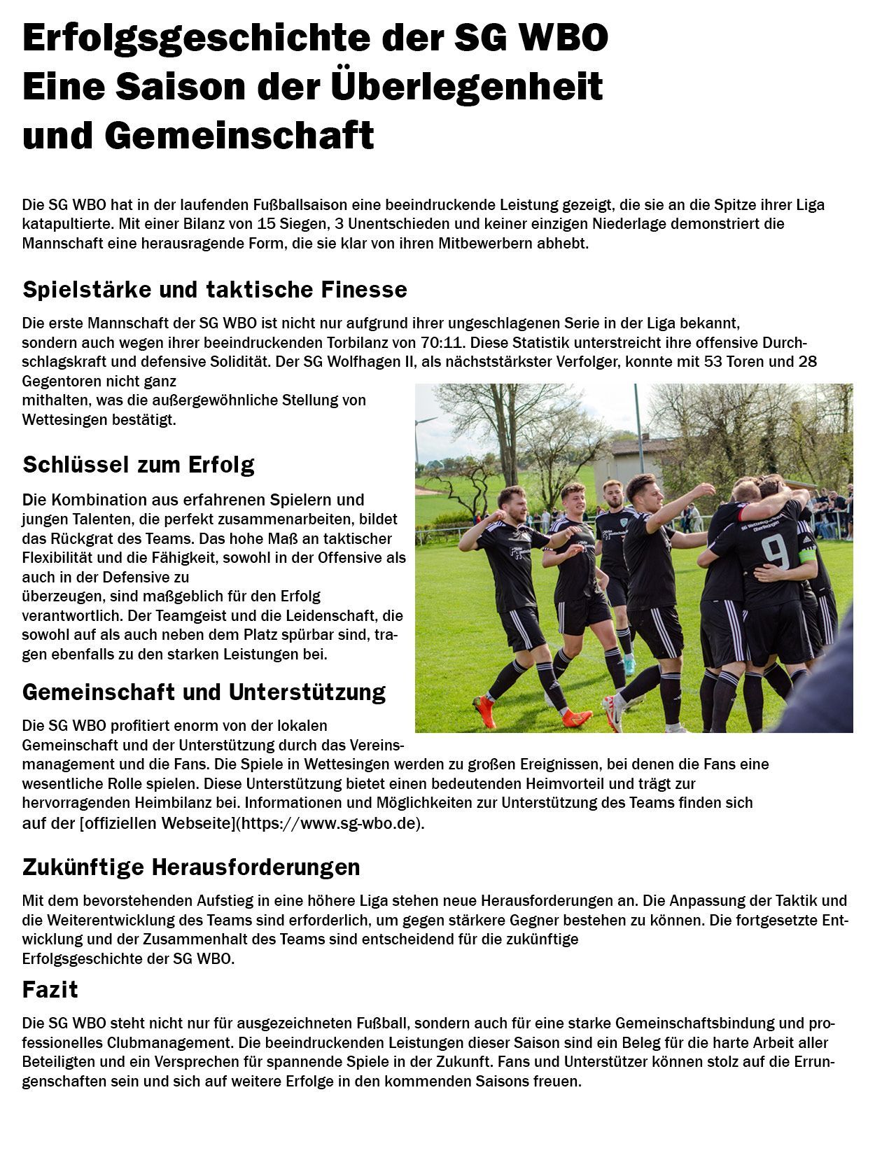Diese Saison war mehr als eine sportliche Verbesserung. Sie war ein Zeichen dafür, was möglich ist, wenn Teamgeist, Trainingsfleiß und Vertrauen ineinandergreifen. Die SG WBO II hat nicht nur Ergebnisse geliefert, sondern auch Emotionen, Leidenschaft und Identifikation mit dem Verein.